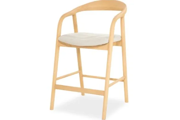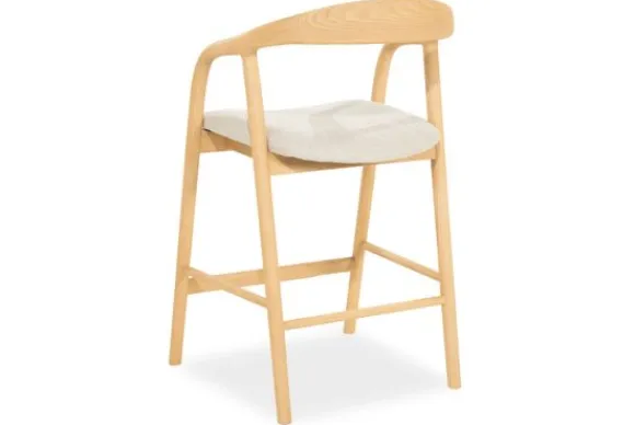 Barkruk Rayven 96355 naturel van het merk Eleonora is een tijdloos en elegant meubelstuk dat een verfijnde balans biedt tussen Scandinavische eenvoud en hedendaags comfort. Het frame van gelakt essenhout toont een subtiel spel van natuurlijke nerven en zachte rondingen. De rugleuning vloeit moeiteloos over in de armsteunen, wat zorgt voor een uitnodigende, organische vormgeving. Het lichte hout straalt warmte en rust uit. De zitting is bekleed met een zachte, neutrale stof die niet alleen comfort biedt, maar ook visuele zachtheid toevoegt. Dit contrast tussen textiel en hout creëert een boeiende dialoog tussen structuur en zachtheid.
