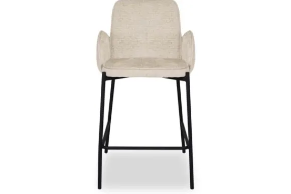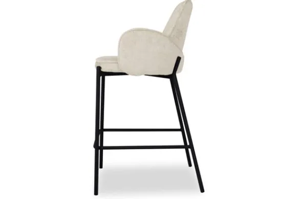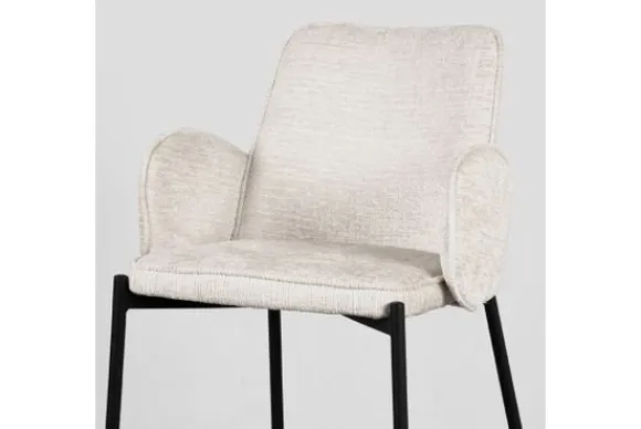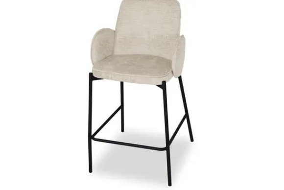 Barkruk Joni, uitgevoerd in cream elegance heeft een luxe ronde zitting, rugleuning en is in het bezit van armleuningen. Deze combinatie maakt Joni een luxe barkruk met ontzettend veel comfort. De armleuningen lopen achter de rugleuning langs waardoor de barkruk een uniek uiterlijk krijgt en er ook nog eens ontzettend leuk uitziet aan de achterkant. Dat is natuurlijk een fijne bijkomstigheid als de barkrukken aangeschoven staan aan tafel of een bar. Het ranke maar doorlopende zwarte frame waar de zitting als ware op rust geeft de barkruk een luchtige uitstraling. Het U-frame zorgt voor een makkelijke op- en afstap en dient als voetensteun. De uiteinde van het frame loopt op vier zijdes een klein stukje door wat zorgt voor een speels effect.