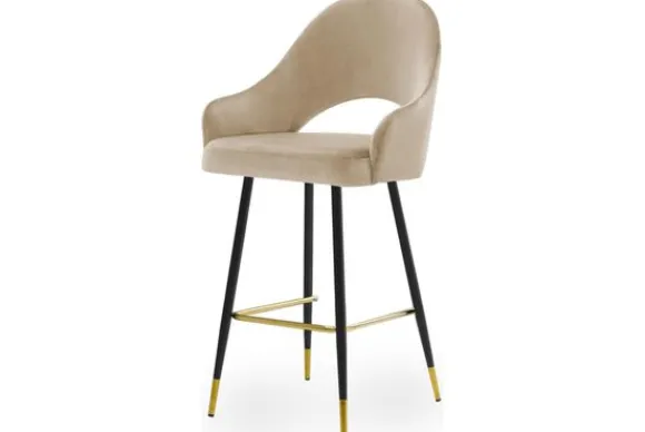 Barkruk Bagneux van het merk Vie Chic is beschikbaar in alle kleuren en in verschillende materiaalsoorten zoals stof, velvet en microvezel. Je kunt kiezen uit verschillende pootkleuren en hoogtes. Een goud detail onderaan de poten is optioneel. Wanneer je kiest voor de barkuk van 98 cm hoog, dan is de zithoogte 66 cm hoog. Wanneer je kiest voor de barkruk van 108 cm hoog, dan is de zithoogte 77 cm. De Bagneux heeft een ronde rugleuning, die doorloopt in armleuningen. Onderin de rugleuning zit een opening. Tussen de poten zit een voetensteun.