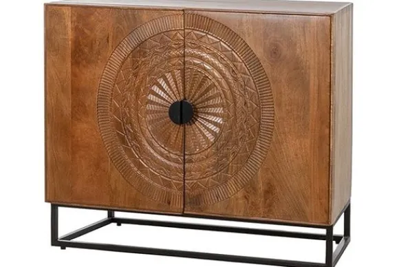 Bergkast Maya MAY.CB.0002 van het merk MySons is gemaakt van mangohout in combinatie met metaal. Geef je interieur een stijlvolle upgrade met deze prachtige kast, vervaardigd uit massief mangohout. Het middelpunt van dit meubelstuk is het indrukwekkende, met de hand uitgesneden patroon op de deuren, dat zorgt voor een authentieke en luxe uitstraling.