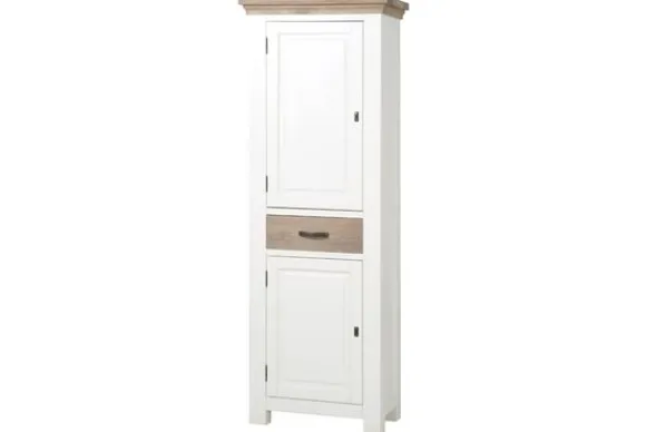 Bergkast Parma MC 0104 van het merk Tower Living wordt geleverd in de kleur wit. De eiken delen worden licht geborsteld en afgewerkt met een olie. Je kunt dit hout makkelijk schoonmaken met een zachte vochtige doek. Deze kast heeft diverse opbergmogelijkheden, namelijk één lade en twee deuren.