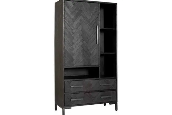 Bergkast Ziano NA 0187 van het merk Tower Living is helemaal trendy, met zijn stoere design, zwarte kleur en visgraat fronten. De fronten zijn gemaakt van prachtig gerecycled hout. De meubelen worden gezandstraald, wat ervoor zorgt dat de nerven in het oude hout extra geaccentueerd worden. De lades zijn voorzien van softclose geleiders. Ziano heeft een luxe en chique uitstraling, maar past ook perfect in een industriële inrichting. Deze kast is voorzien van één deur, twee grote lades en vier open vakken, je kunt de lades en deuren openen met een smalle metalen handgreep.
