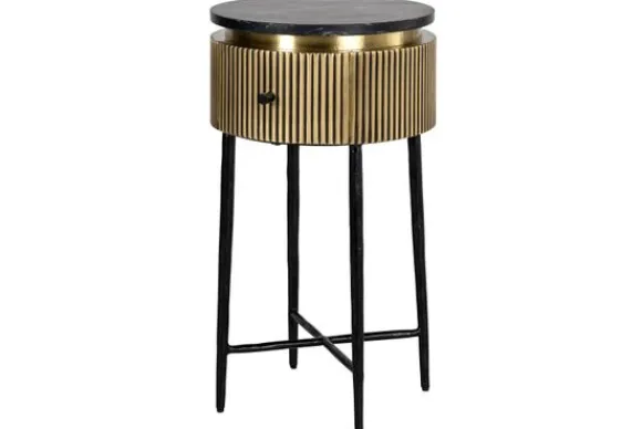 Bijzettafel Ironville 211717 van het merk Richmond Interiors is een unieke bijzettafel met een jaren 60 stijl dat in een nieuw jasje is gestoken. De tafel heeft een luxe uitstraling door zijn strakke vorm gecombineerd met het ribbelmotief in de antieke messingkleur. Het blad is gemaakt van marmer. Marmer is een duurzame steensoort en heeft een luxe en stijlvolle uitstraling. De steensoort is een natuurproduct en kenmerkt zich door de unieke afwerkingen en kan zowel grove als gladde delen bevatten. Door de kenmerkende kleurschakeringen en aders is geen product hetzelfde. Zo haal je met een marmer product dus echt iets unieks in huis. Let op: marmer is een natuursteen, daardoor kan de print van het blad iets afwijken van de foto.