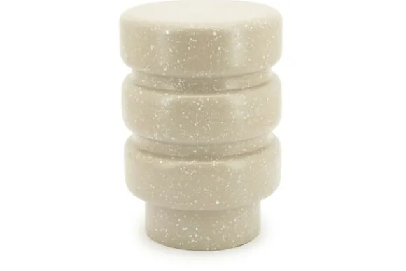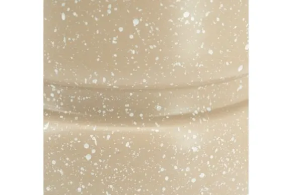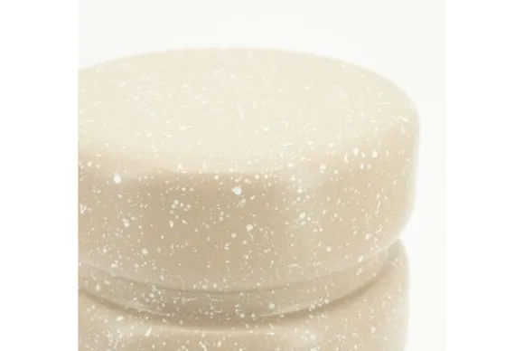 De robuuste, gelaagde vormgeving geeft de tafel een sculpturale en dynamische look, terwijl het gladde oppervlak zorgt voor een verfijnde afwerking. De neutrale kleur met verfspetters voegt een speels accent toe.