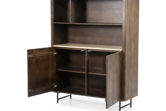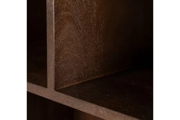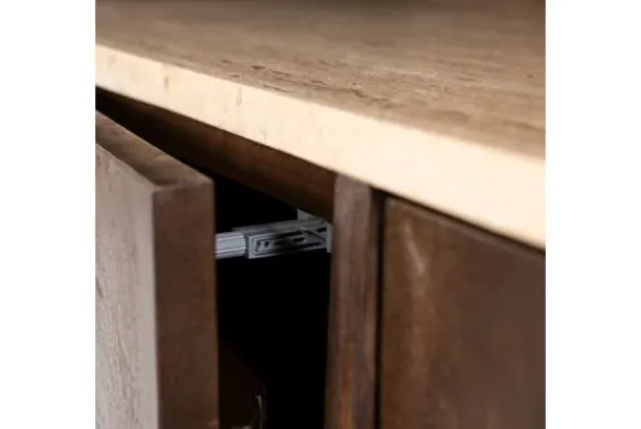 De boekenkast is gemaakt van mangohout. Dit hout heeft zichtbare kleurschakeringen en natuurlijke verschillen in het oppervlak, waardoor elke kast net anders is. Mangohout is stevig en geschikt voor dagelijks gebruik. De plank boven de deuren is uitgevoerd in travertin. Dit is een natuursteen in een lichte beige tint met kleine open structuren. Travertin is sterk en eenvoudig schoon te maken met een licht vochtige doek.