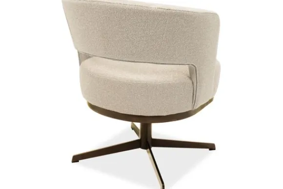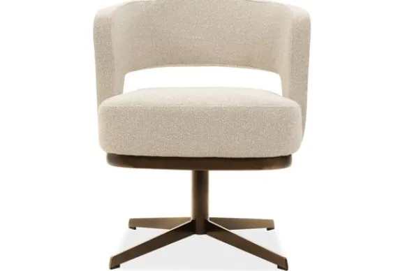 De stoel rust op een stevige bronzen poot en is 360 graden draaibaar, wat zorgt voor extra gebruiksgemak en flexibiliteit aan tafel.