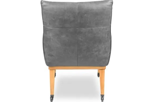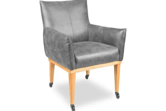 Deze stoel wordt standaard geleverd met houten poten met wielen en een geknepen naad. Er kan gekozen worden voor andere poten of een dichte naad onder “Kies je extra’s”. Ook kan er hier gekozen worden om de stoel 5 cm extra zitbreedte te geven.