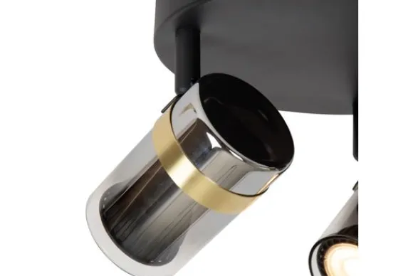 Plafondlamp Upton van het merk Lucide is een stijlvol middelpunt voor wie houdt van gericht licht en een luxueuze afwerking. De ronde plafondplaat in matzwart ondersteunt drie verstelbare spots in gerookt glas, elk geaccentueerd met een elegante messingkleurige ring. Deze combinatie van materialen zorgt voor een subtiel spel tussen licht, kleur en textuur.