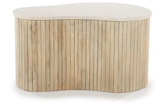 De basis van de tafel is gemaakt van mango hout, bekend om zijn duurzaamheid en mooie, warme uitstraling. Het hout is verticaal geribbeld, wat zorgt voor een mooie textuur en een speelse interactie tussen het strakke marmer en het natuurlijke hout. Deze tafel is perfect voor liefhebbers van natuurlijke materialen en organische vormen, en zal zeker een blikvanger zijn in elke woonkamer.
