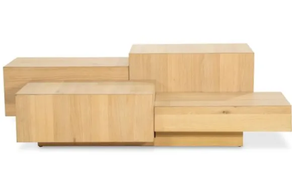 Salontafel Quinten 96388 naturel van het merk Eleonora is vervaardigd uit hoogwaardig eiken fineer, en valt direct op door zijn gelaagde blokstructuur die doet denken aan een kunstobject. De asymmetrische opbouw creëert een subtiel spel van hoogtes en schaduwen – alsof elk element zijn eigen podium krijgt.