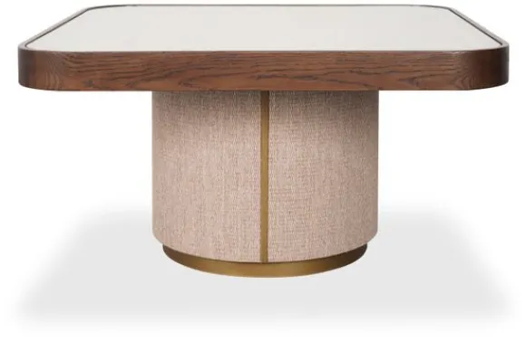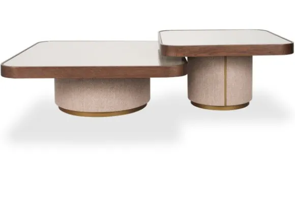 De twee tafels verschillen subtiel in hoogte, waardoor ze speels over elkaar heen vallen. Dit zorgt voor een dynamisch effect dat uitnodigt om telkens opnieuw te kijken. De robuuste ronde voet met linnen bekleding vormt een krachtig contrast met het gladde glazen blad.