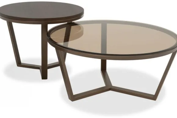 Salontafelset Cosa van het merk BL Design bestaat uit 2 salontafels. De 46 cm hoge salontafel is uitgerust met een Ø60 cm tafelblad van Burnt Sienna hout en de andere salontafel van 38 cm heeft een Ø80 cm tafelblad van Smoked glas. Alle interieurstukken hebben een spinpoot in de kleur Anodic Brown en hebben de mogelijkheid om het materiaal en de pootkleur aan te passen.