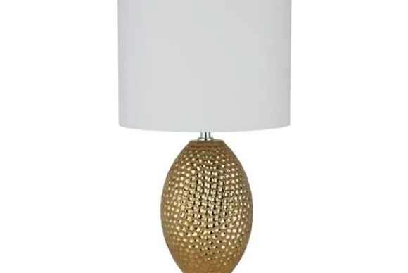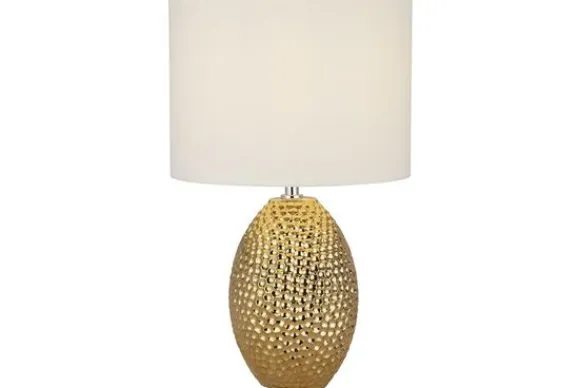 Tafellamp EU1034-1GO Nadine van Searchlight heeft een gouden voetstuk van keramiek en een gestoffeerde witte lampenkap. Deze lamp heeft een E27 fitting.