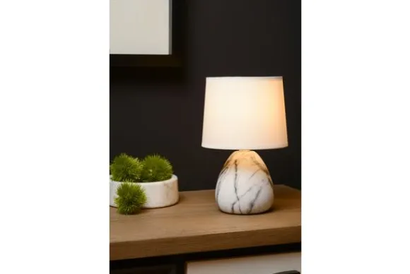 Tafellamp Marmo van het merk Lucide is tijdloos en elegant. Met een marmeren look geef je je interieur meteen dat extra stijlvolle tintje. Met deze keramische tafellamp krijg je hetzelfde effect. De linnen kap vangt het licht en creëert een speelse schijn op de donkere nerven van de poot. Op een tafel, commode, bureau of open wandkast. De tafellamp steelt in elk interieur de show. De lamp is gemakkelijk te bedienen via de aan en uitschakelaar op het snoer.