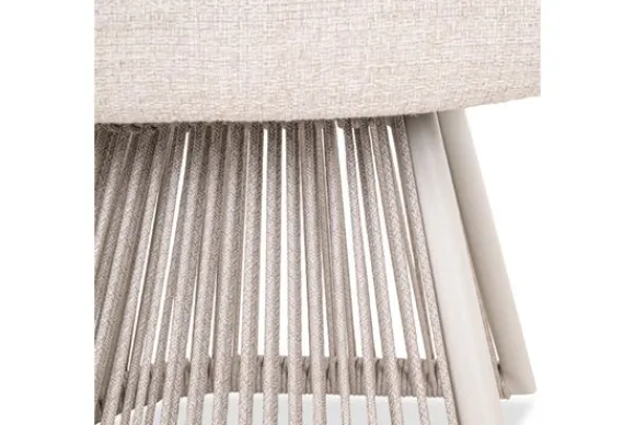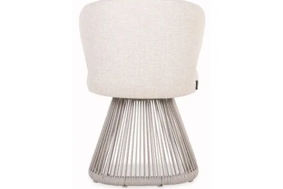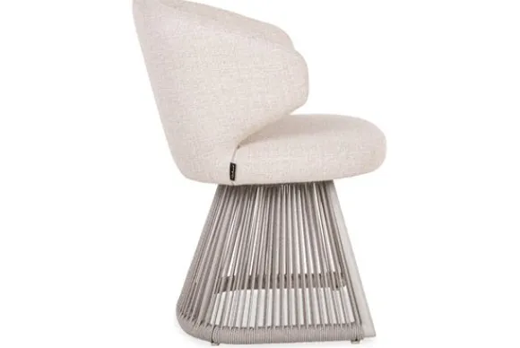 Tuinstoel Nuba is voorzien van een stevige vorm die je lichaam prettig omsluit. De zitting is bekleed met stof in een rustige beige tint die makkelijk te combineren is. De onderkant is opgebouwd uit touw en aluminium wat zorgt voor stabiliteit en een speels lijnenspel.