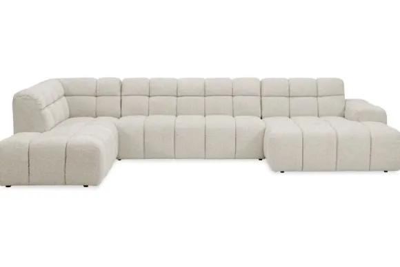 Bankstel Treviso van het merk Moderno is een bank met geblokte zit- en rugkussens en een zitting die doorloopt tot net boven de grond.