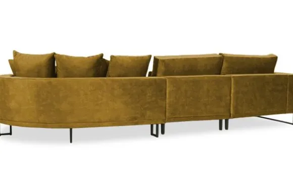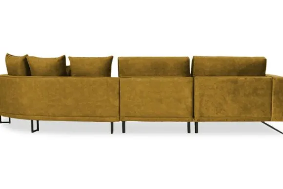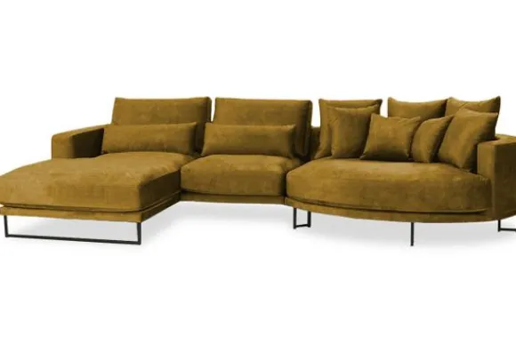 Loungebank Dordoni II van het merk Be Inspired is verkrijgbaar in alle kleuren en in materiaalsoorten zoals ribstof, teddy en velvet. De Dordoni II bank wordt standaard uitgevoerd met alle sierkussens en lendekussens die ook op de foto te zien zijn. De rugkussens daar achter zijn lekker hoog, deze combinatie zorgt voor een goede ondersteuning van de rug. Alle rugkussens zitten los en zijn omkeerbaar, de zitkussens zitten vast met klittenband. Het unieke aan de Dordoni II is het ronde loungegedeelte. Je kunt hier lekker wegkruipen tussen alle sierkussens. Deze bank oogt ruimtelijk door de hoge metalen sledepoten.