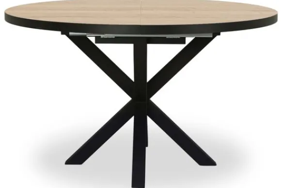 Uitschuiftafel Juster-Isla van het merk Lamulux is hier afgebeeld in de frisse kleur Fresh Oak. Deze lichte houttint geeft de tafel een natuurlijke uitstraling die goed past in zowel moderne als Scandinavische interieurs. De tafel is verkrijgbaar in meerdere afmetingen en kleuren en staat stevig op een zwart metalen onderstel. Het blad is eenvoudig uitschuifbaar waardoor je direct meer ruimte creëert. In uitgeschoven stand verandert de vorm in een ovaal tafelblad.