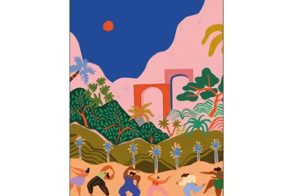 Wandkleed Dancing in Paradise van het merk Urban Cotton is een levendig kunstwerk vol expressie en beweging. De afbeelding toont dansende figuren in een tropisch fantasielandschap, omgeven door kleurrijke bomen, glooiende heuvels en een diepblauwe hemel met een vurige rode zon. Perfect voor een modern interieur met een boho touch of een kleurrijk eclectisch interieur waar kunst centraal staat. Een ode aan vrijheid, vrouwelijkheid en fantasie.