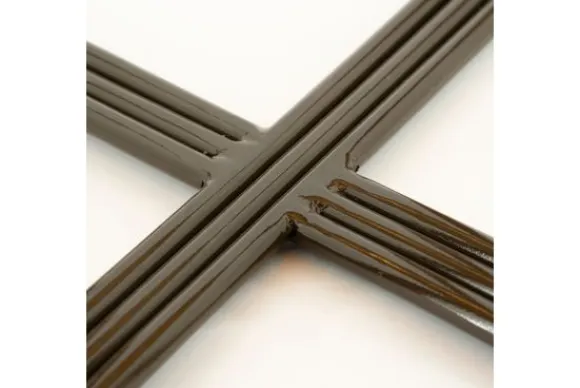 Het glazen tafelblad rust op een bijzonder onderstel dat bestaat uit gebogen metalen buizen die samen een kruismotief vormen.