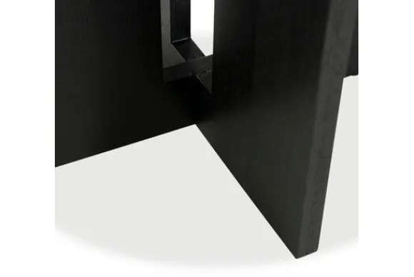 Het onderstel, bestaande uit vier zwarte panelen in een geometrische opstelling, vormt een krachtig contrast met het lichte bovenblad. De diepe houtstructuur van het eikenfineer voegt een tactiele diepte toe aan de zwarte basis, waardoor de tafel een verfijnde gelaagdheid krijgt.