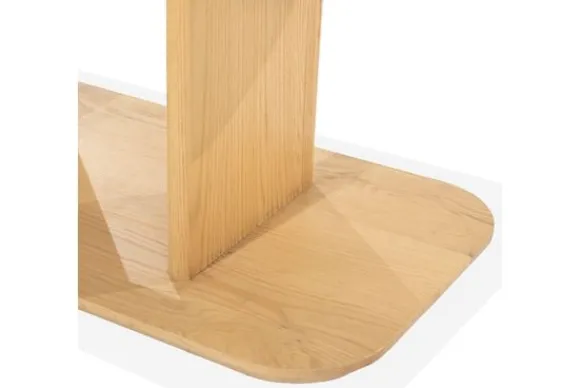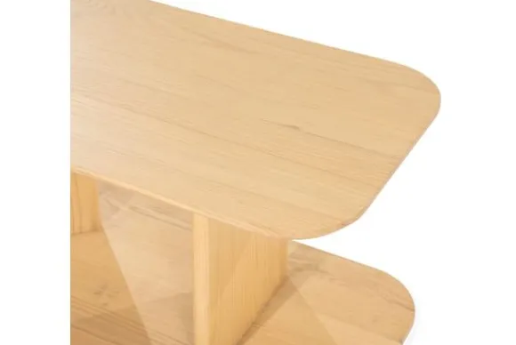 Bijzettafel Ty is uitgevoerd in eikenhout. De natuurlijke houtnerf blijft zichtbaar en geeft het oppervlak een rustige uitstraling. De tafel heeft twee bladen en een open constructie met een centraal verticaal paneel, wat zorgt voor extra gebruiksruimte zonder dat de tafel massief oogt.
