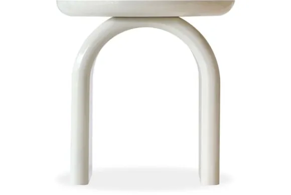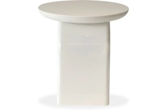 Bijzettafel Merrick 214206 van het merk Richmond Interiors in de kleur Coconut White heeft een opvallend rond blad met een stevige boogvormige poot. De hoogglans afwerking zorgt voor een strakke, moderne look.