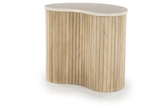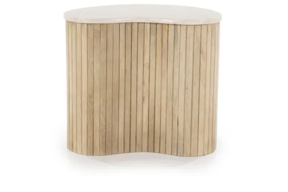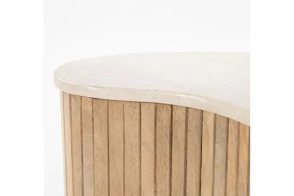 De basis van de tafel is gemaakt van mango hout, bekend om zijn duurzaamheid en mooie, warme uitstraling. Het hout is verticaal geribbeld, wat zorgt voor een mooie textuur en een speelse interactie tussen het strakke marmer en het natuurlijke hout. Deze tafel is perfect voor liefhebbers van natuurlijke materialen en organische vormen, en zal zeker een blikvanger zijn in elke woonkamer.