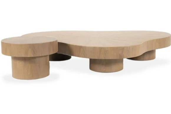 Salontafelset Bobbie van het merk Eleonora bestaat uit een salontafel (96318) en bijzettafel (96319). De organisch gevormde tafel van 150 cm breed en 25 cm hoog en de compacte ronde bijzettafel, met een diameter van 45 cm en hoogte van 30 cm, vormen samen een stijlvol set. De ronde vormen en de lichtbruine kleur, van zowel het tafelblad als het onderstel, zorgen voor een natuurlijke uitstraling die past bij diverse woonstijlen.