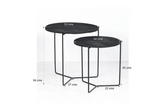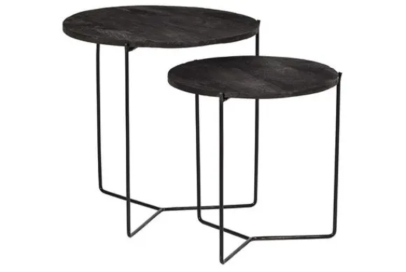 Bijzettafels Mason black van het merk Brix bestaan uit twee tafels uitgevoerd in mangohout en gecoat staal. De afmetingen van de tafels zijn B52 x D52 x H53 cm en B45 xD45 x H45 cm.