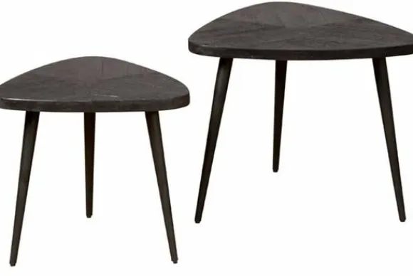De salontafels hebben een blad van mangohout met een duidelijk zichtbaar visgraat motief. Mangohout heeft natuurlijke kleurschakeringen en verschillen in het oppervlak, waardoor elke tafel net anders is. Het onderstel is gemaakt van zwart gecoat staal en zorgt voor een stevige basis.