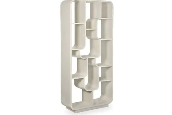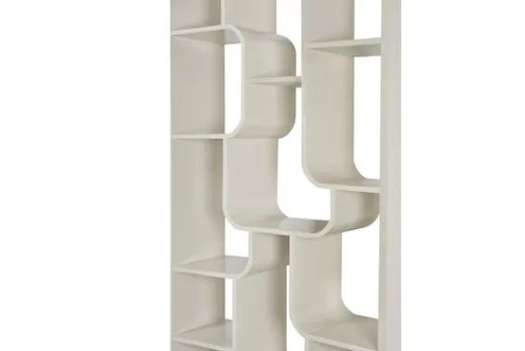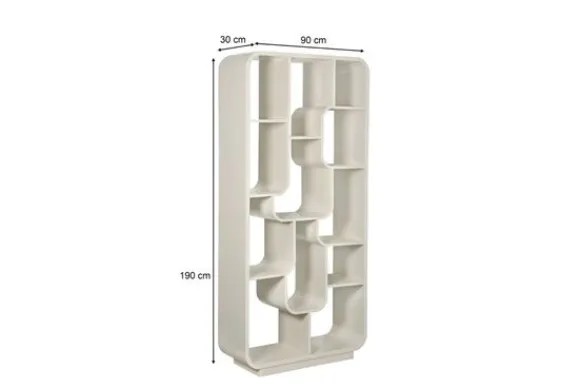 Boekenkast Logan van het merk Livingfurn brengt een moderne rust in huis dankzij zijn zachte off white kleur en afgeronde vormen. Het unieke lijnenspel en de speelse indeling geven deze kast een frisse uitstraling die perfect past in een Scandinavisch interieur, waar licht en eenvoud de ruimte laten ademen. De open vakken wisselen van formaat en vormen samen een dynamisch geheel dat zorgt voor diepte en karakter. Elk vak nodigt uit om gevuld te worden met boeken, accessoires of persoonlijke herinneringen.
