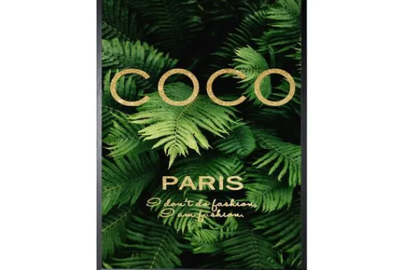 Art Print Chanel Groen FA-94 van het merk Luxe Framing Art is een print waarop een goudgekleurde uitspraak van Coco Chanel staat. De achtergrond is een afbeelding van groene varens. Deze print is verkrijgbaar in verschillende afmetingen en wordt standaard geleverd met een zwarte lijst.