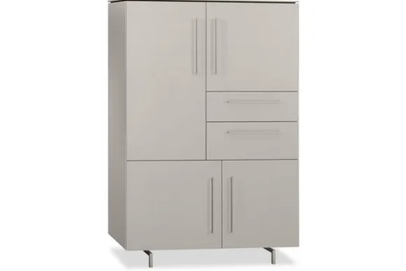 De Ortega bergkast beschikt over een ruime indeling met deuren, lades en opbergvakken. Hierdoor is er voldoende ruimte om spullen overzichtelijk op te bergen. Alle deuren en lades zijn voorzien van softclose, wat zorgt voor een stille en soepele sluiting en prettig dagelijks gebruik.