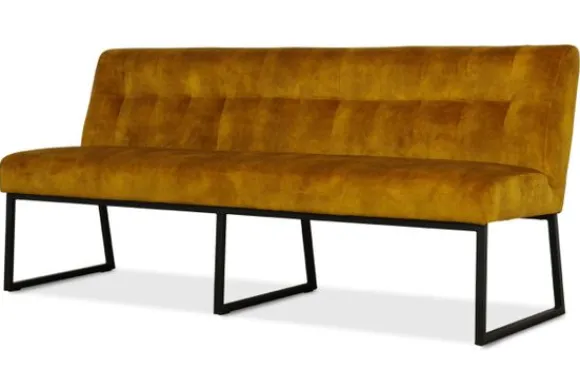 Deze eetbank is voorzien van zwart metalen poten en een blokstiksel in de rugleuning. De Bullock is ook beschikbaar met andere stiksels in de rug. Deze eetbank heeft een simpel, elegant design. Twee handgrepen achter op de rugleuning zijn optioneel.