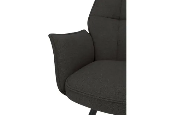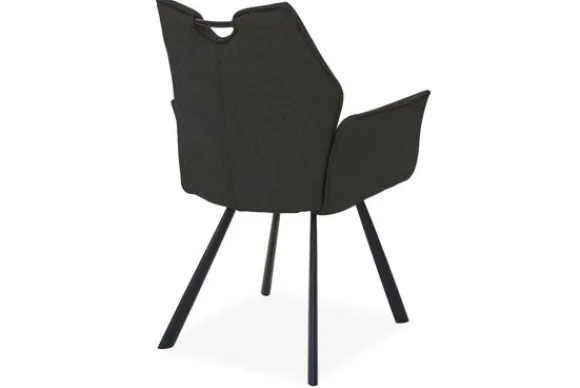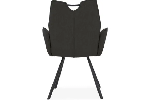 Het verfijnde stiksel in de rugleuning benadrukt de vorm en geeft de stoel een speels detail. De zwarte metalen poten zorgen voor een stoer contrast en bieden stabiliteit.