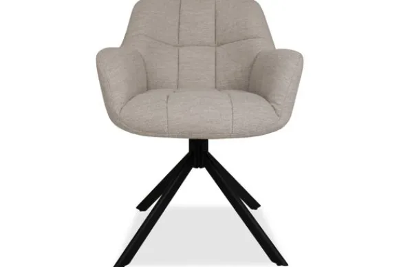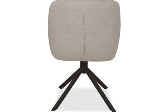 De eetkamerstoel heeft een zwart metalen spinpoot en is voorzien van armleuningen en stiksels in de rugleuning.