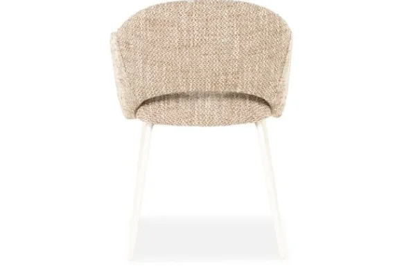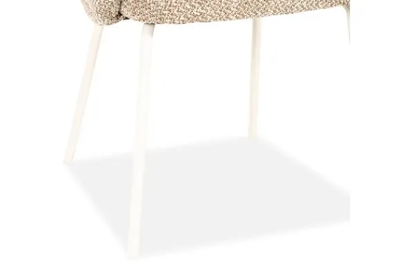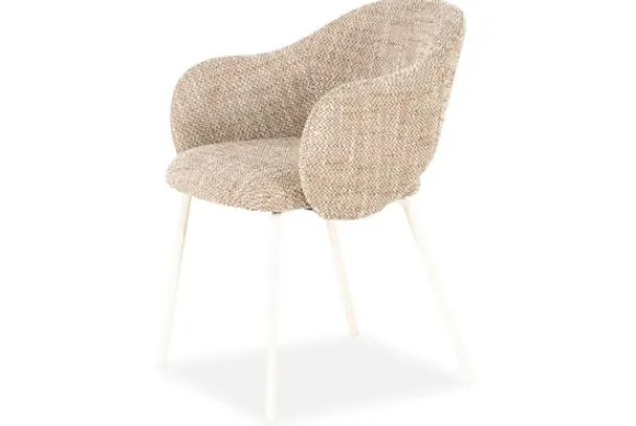 De subtiele opening tussen rug en zitting geeft de eetstoel een luchtig karakter. De zachte bekleding nodigt uit tot lang tafelen, terwijl de slanke metalen poten zorgen voor een stabiele basis.