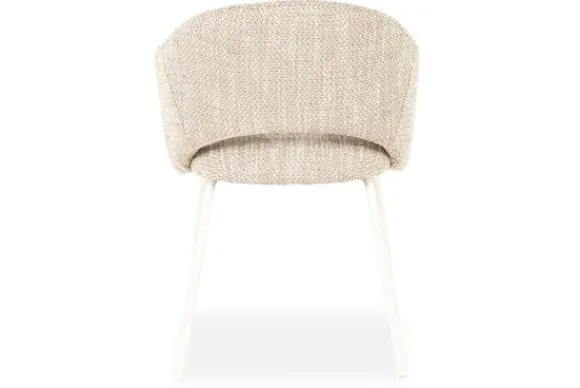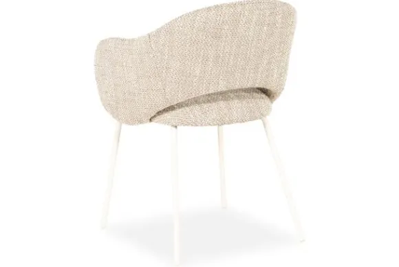 De subtiele opening tussen rug en zitting geeft de eetstoel een luchtig karakter. De zachte bekleding nodigt uit tot lang tafelen, terwijl de slanke metalen poten zorgen voor een stabiele basis.