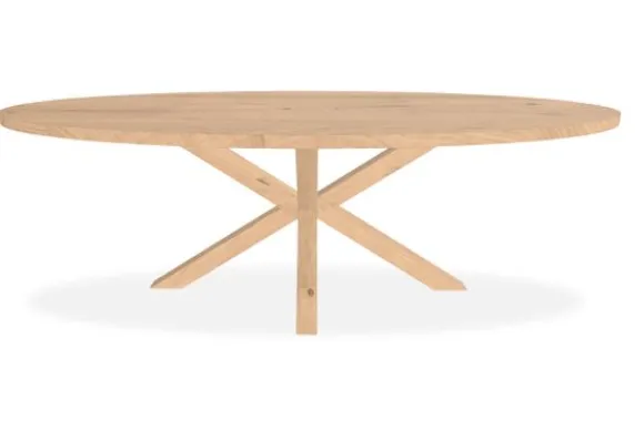 Eettafel Alvin van het merk De Houtmaatschappij heeft een ovale vorm met een 2+2 cm opgedikt blad, waardoor de poot stevig in het blad valt en de randen dikker zijn. Vanaf de maat 280 cm heeft de tafel een volledig massief blad van 4 cm dik.