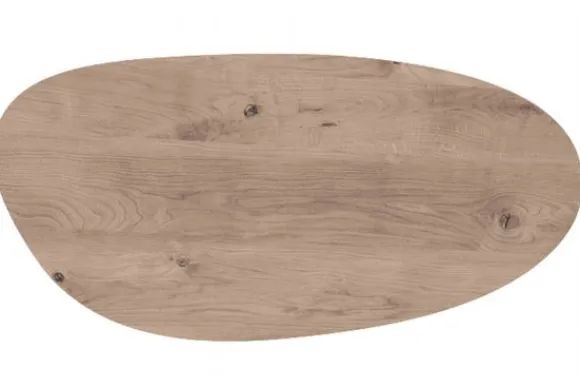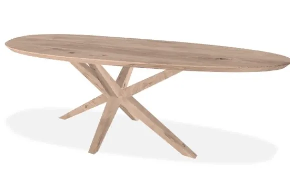 Eettafel Alvin van het merk De Houtmaatschappij heeft een kiezelvormig blad dat is uitgevoerd met een 2+2 cm opgedikte rand. Dit zorgt ervoor dat de poten netjes onder het blad vallen en het geheel stevig is afgewerkt. Maten 240 cm met een diepte van 130 cm en groter hebben een volledig massief blad van 4 cm dik.