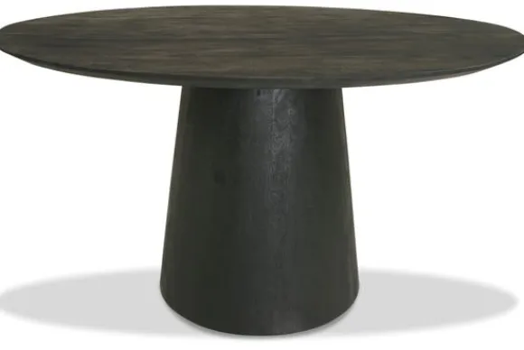 Eettafel Silvam Black van het merk Wood Wonders is direct uit voorraad leverbaar. Deze tafel heeft een rond blad met een diameter van 130 cm, een taps aflopende rand en is gemaakt van mangohout. Mangohout kun je herkennen aan de vele kleurschakeringen en ongelijkheden in het oppervlakte van het hout, waardoor geen enkel meubelstuk hetzelfde is. De kleuren in mangohout kunnen variëren van lichte- tot donkere tonen. Mangohout is een duurzame houtsoort. Hieronder vind je een robuuste houten kegelpoot. Deze poot zit in het midden van het blad, zodat je overal rondom de tafel stoelen kan plaatsen.