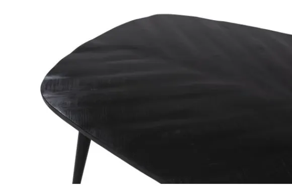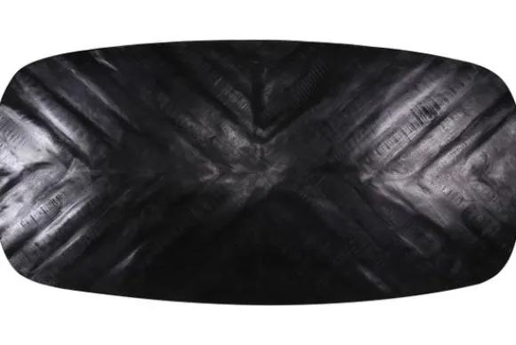 Het tafelblad is gemaakt van zwart gelakt mangohout, dat in een verfijnd visgraat kruispatroon ligt. De houtsoort heeft vele kleurschakeringen en ongelijkheden in het oppervlak, wat een natuurlijke en unieke look geeft.
