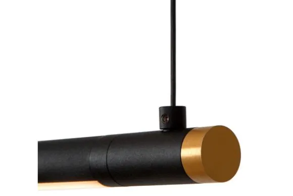 Hanglamp Marnik van het merk Lucide is een verfijnde lichtoplossing voor liefhebbers van strak design en slimme technologie. De slanke, cilindervormige lamp in matzwart met subtiele gouden accenten is vervaardigd uit hoogwaardig aluminium, wat zorgt voor een moderne, luxe uitstraling. De minimalistische vorm lijkt te zweven in de ruimte en maakt van Marnik een stijlvol statement boven de eettafel of het bureau.