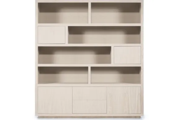 Het kabinet heeft open vakken in diverse formaten en is voorzien van vier deuren en twee lades. Deze indeling biedt veel ruimte voor servies accessoires of andere spullen. Het kabinet maakt deel uit van een met bijpassende meubels.