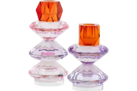 Kandelaar Yalena 212685 van het merk Richmond Interiors is vervaardigd uit glas. De kandelaar heeft een unieke uitstraling door de verschillende vormen. De kandelaar is doorzichtig paars en oranje van kleur en is geschikt voor dinerkaarsen.