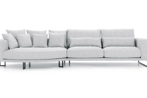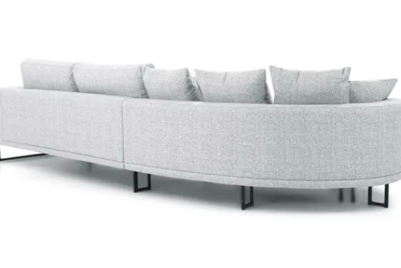 Loungebank Dordoni II van het merk Be Inspired is verkrijgbaar in meer dan 200 kleuren. Tevens is de bank leverbaar in materiaalsoorten zoals ribstof, teddy en velvet. Je kunt kiezen uit diverse afmetingen. De Dordoni II bank wordt standaard uitgevoerd met alle sierkussens en lendekussens die ook op de foto te zien zijn. De rugkussens daar achter zijn lekker hoog, deze combinatie zorgt voor een goede ondersteuning van de rug. Alle rugkussens zitten los en zijn omkeerbaar, de zitkussens zitten vast met klittenband. Het unieke aan de Dordoni II is het ronde loungegedeelte. Je kunt hier lekker wegkruipen tussen alle sierkussens. Deze bank oogt ruimtelijk door de hoge metalen sledepoten.
