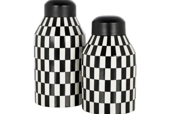 Pot Malou 211542 klein van het merk Richmond Interiors is gemaakt van metaal en resin, dit is een mix van gemalen steen in combinatie met vloeibare kunsthars. De pot is een zwart/wit geblokt accossoire wat je interieur compleet maakt. Tip: combineer deze pot met de grotere variant.