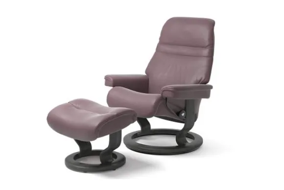 Relaxfauteuil Sunrise Classic van het merk Stressless is verkrijgbaar in alle kleuren. Tevens is de fauteuil leverbaar in stof en rundleder. Je kunt bij deze fauteuil kiezen uit diverse maten zoals Small, Medium en Large. Deze fauteuil heeft een Plus en Glide Systeem: Aan beide zijden van de fauteuil zit een knop waarmee je de weerstand van de stoel kan aanpassen naar eigen behoefte. Door de knoppen in tegengestelde richting te draaien stel je jouw ideale relaxpositie samen. Op die manier krijgt de nek en de onderrug goede onderstuening. Door de rugleuning naar voren te buigen activeer je de slaapfunctie. Op het moment dan je weer rechtop komt stelt de stoel zichzelf weer bij naar de normale stand.
