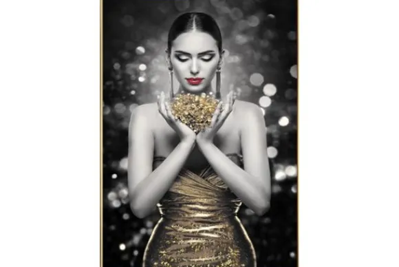 Schilderij Lady CA-DRESS van het merk Luxe Framing art is een kunstwerk op canvas. Canvas is een duurzame stof en heeft een prettige, matte uitstraling. Op dit schilderij is een vrouw afgebeeld met gouden edelstenen in haar handen. Het schilderij is zwart-wit met gouden en rode details. Dit schilderij wordt standaard geleverd met een gouden lijst.